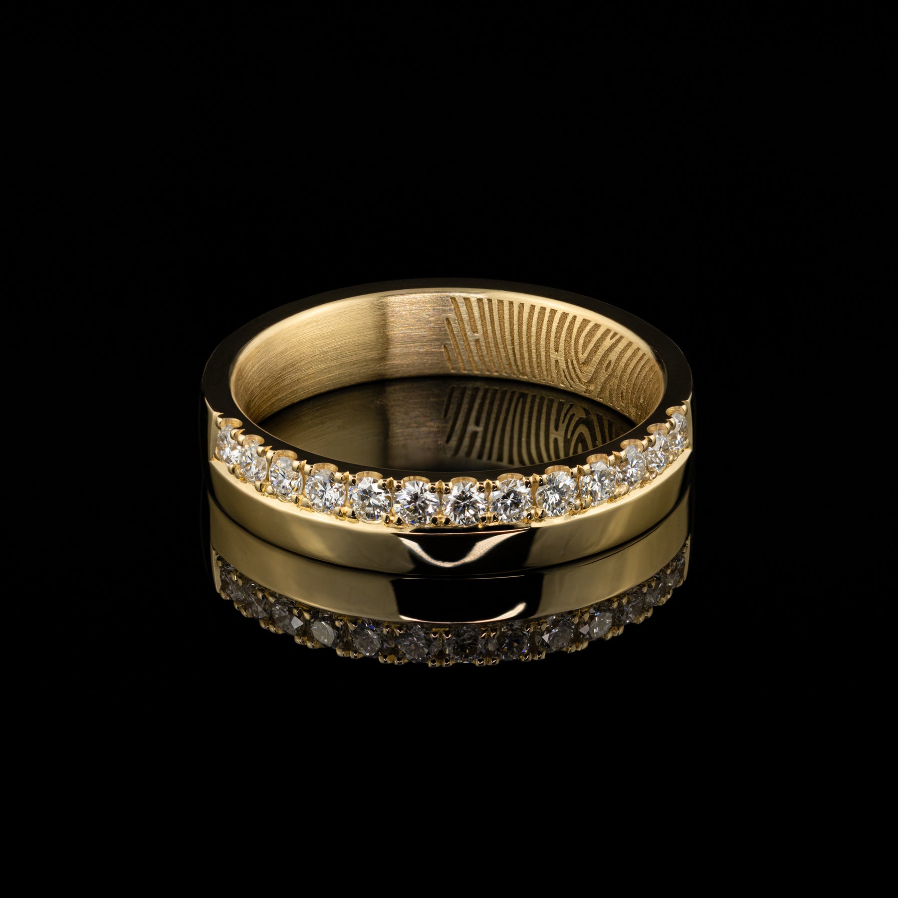 besonderer Individueller Trauring von Goldzeit aus Nuernberg, offener Verschnitt am Rand, Castle-Setting, Brillanten, Gelbgold, Seitenansicht