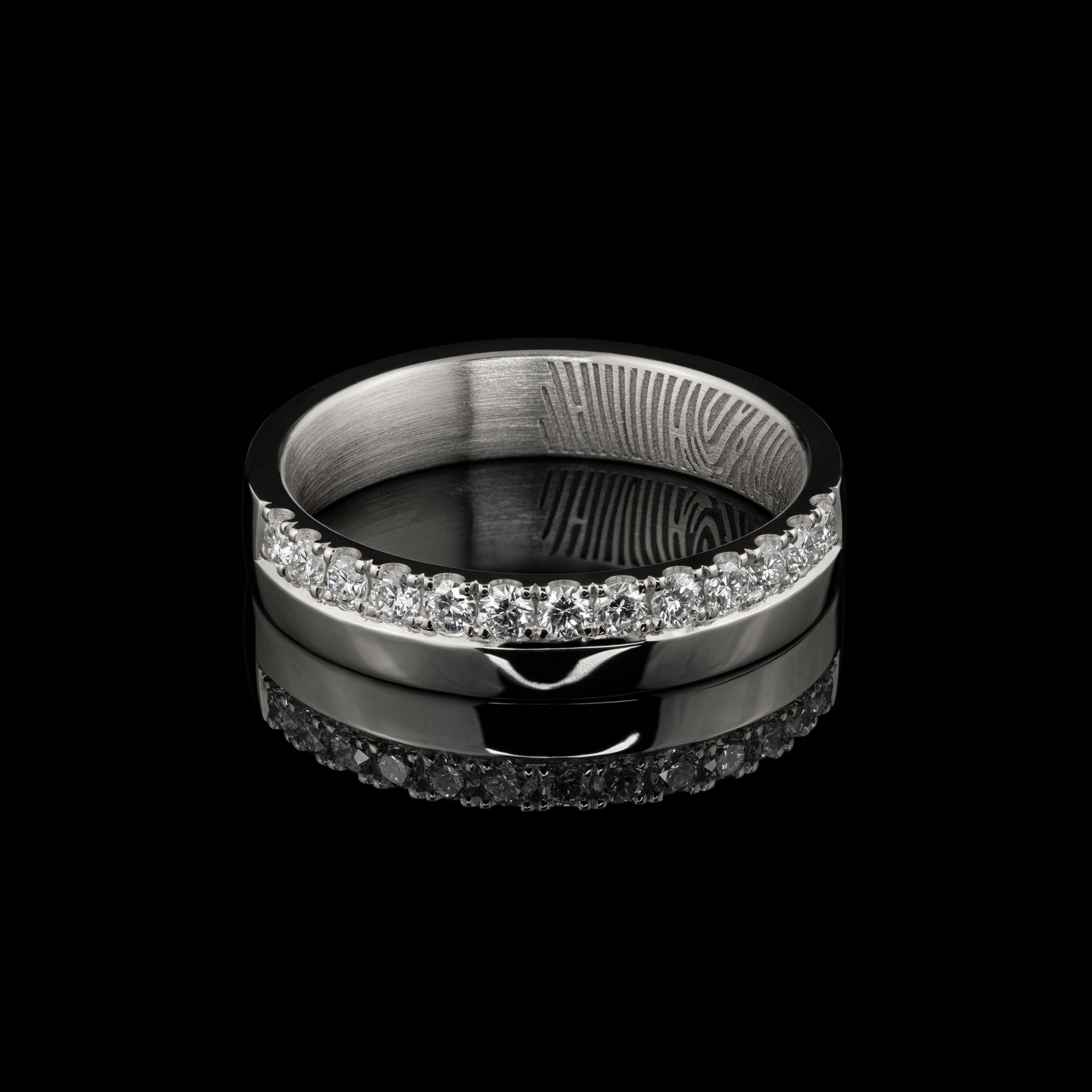 Das Besondere ist die funkelnde Reihe feiner Brillanten auf dem Rand der Ringschiene, die das Licht aus jedem Winkel einfängt. Sie werden gleichmäßig im Castle-Setting gefasst, sodass die Steine auch seitlich gut zu sehen sind.