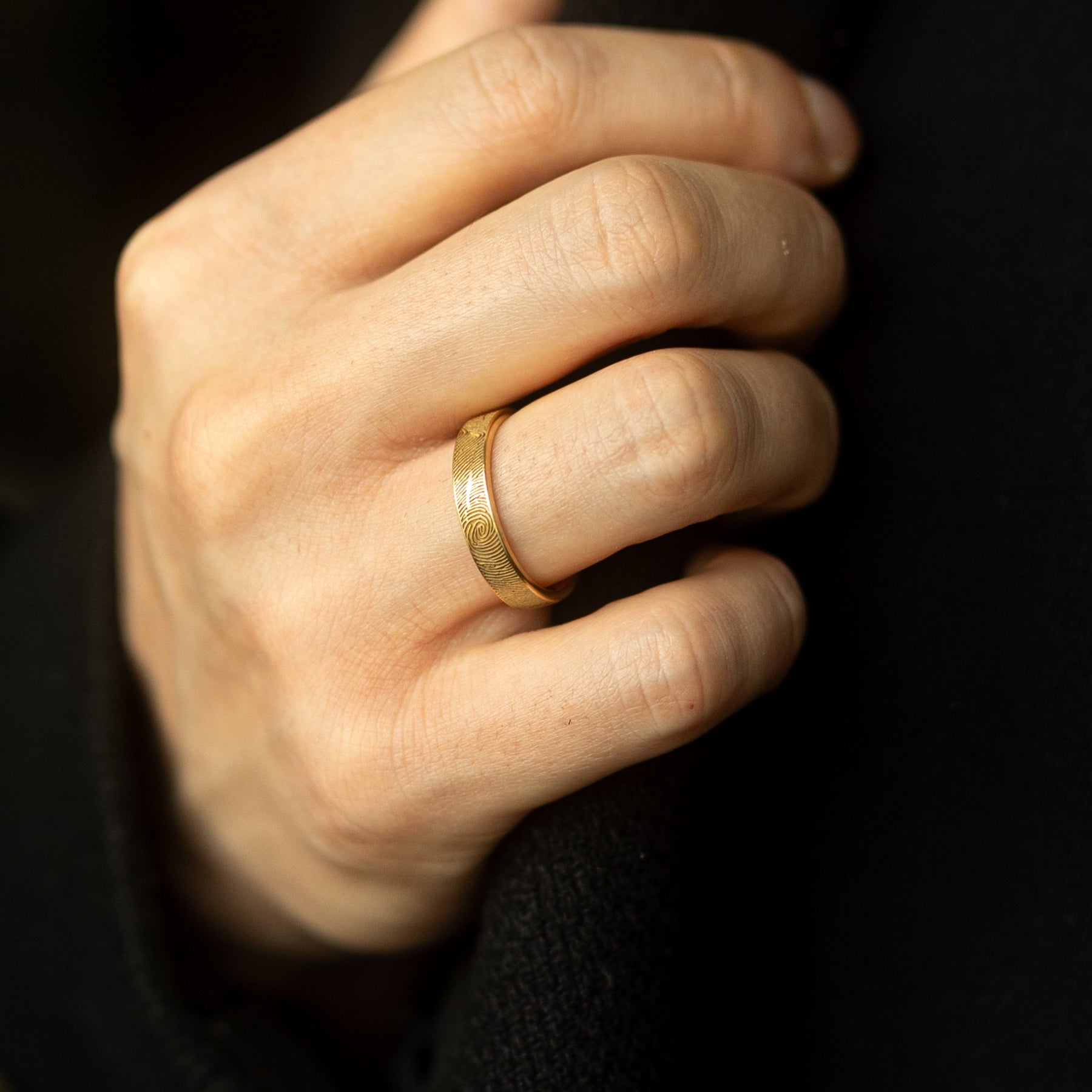Über etwa die Hälfte des Rings sind 3 Fingerabdrücke deiner Liebsten graviert, mit einem flüssigen Übergang arrangiert. Die glatte Oberfläche von Eric ist außen & innen seidenmattiert, eine edle Oberflächenstruktur, die optisch der Lasergravur den Vortritt lässt. Auch eine Politur ist denkbar, schreib uns bei Bestellung gerne einen Hinweis, wenn du Ring Eric poliert möchtest.