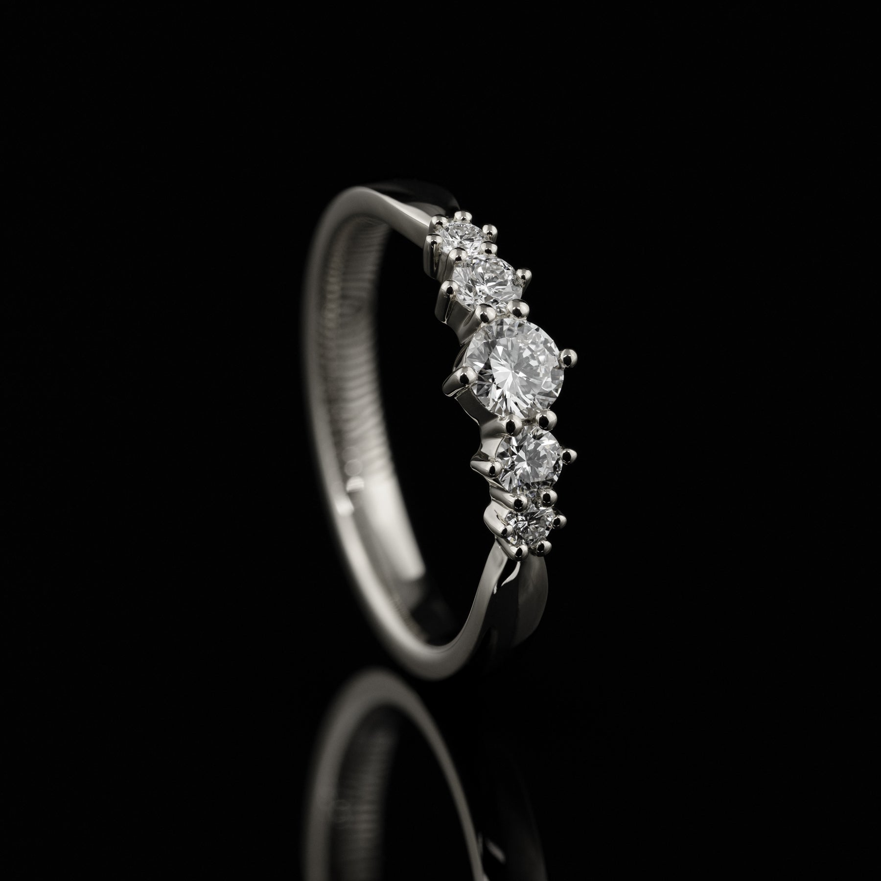 Die harmonisch ansteigende Anordnung der Diamanten lässt die Mitte erstrahlen und verleiht dem Ring eine natürliche Dynamik. Die Ringschiene verjüngt sich leicht zum Steinbesatz hin und gibt dem Design einen grazilen Touch.