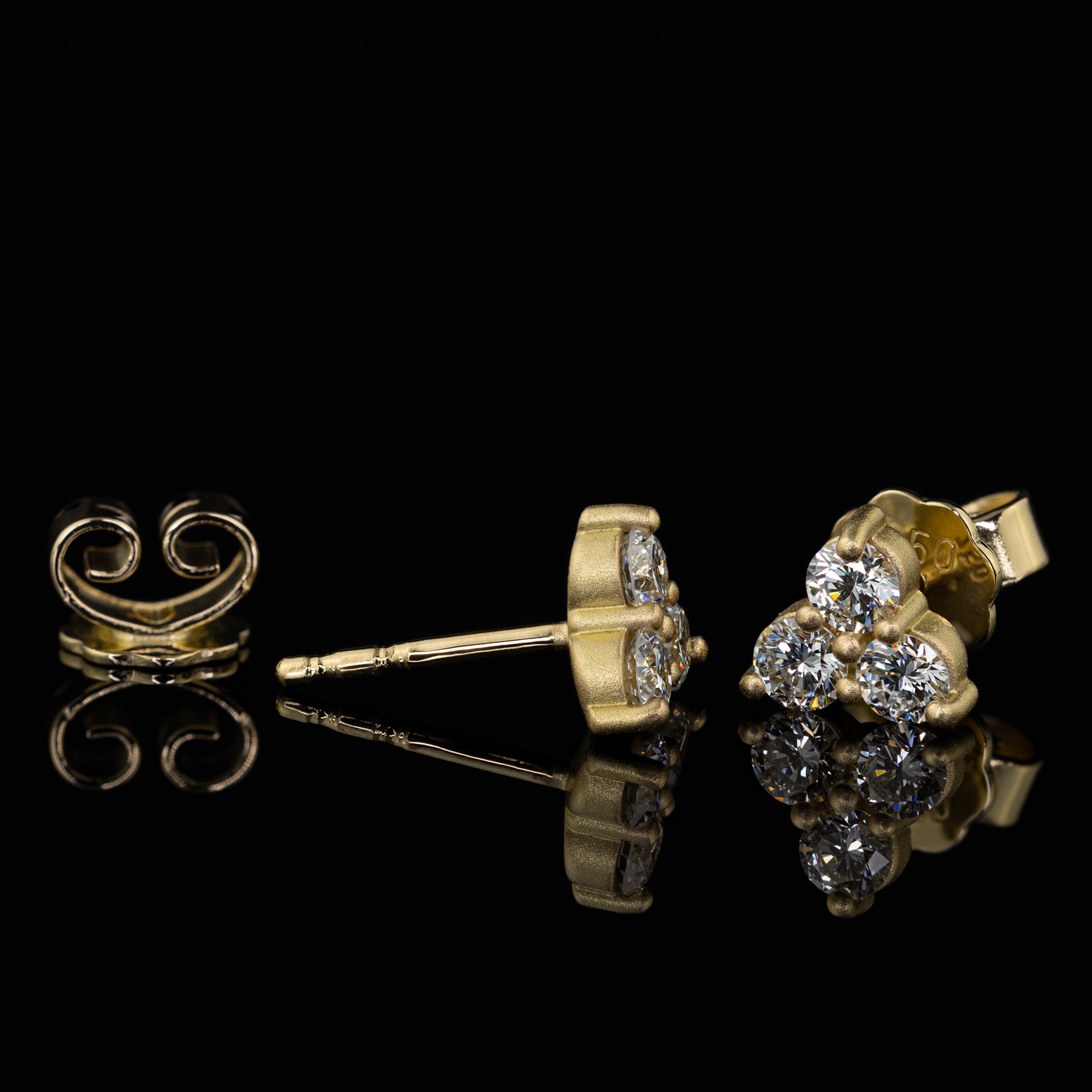 Die drei Brillanten sitzen dicht nebeneinander und werden von kleinen Krappen bombenfest gehalten. Das mattierte Gold erzeugt einen tollen Kontrast, der die Edelsteine noch mehr in den Vordergrund stellt. Auf Wunsch können wir deine Ohrringe auch polieren.