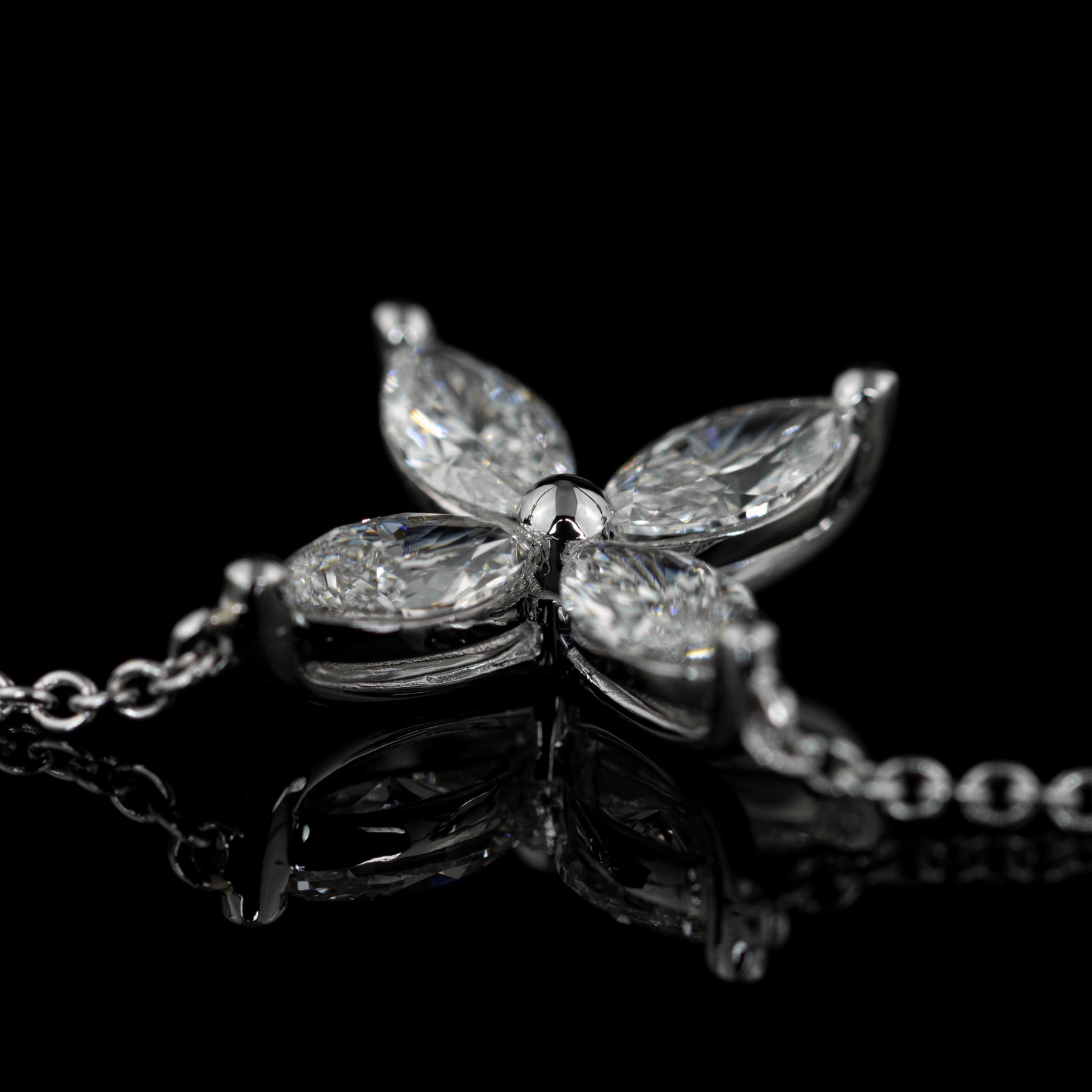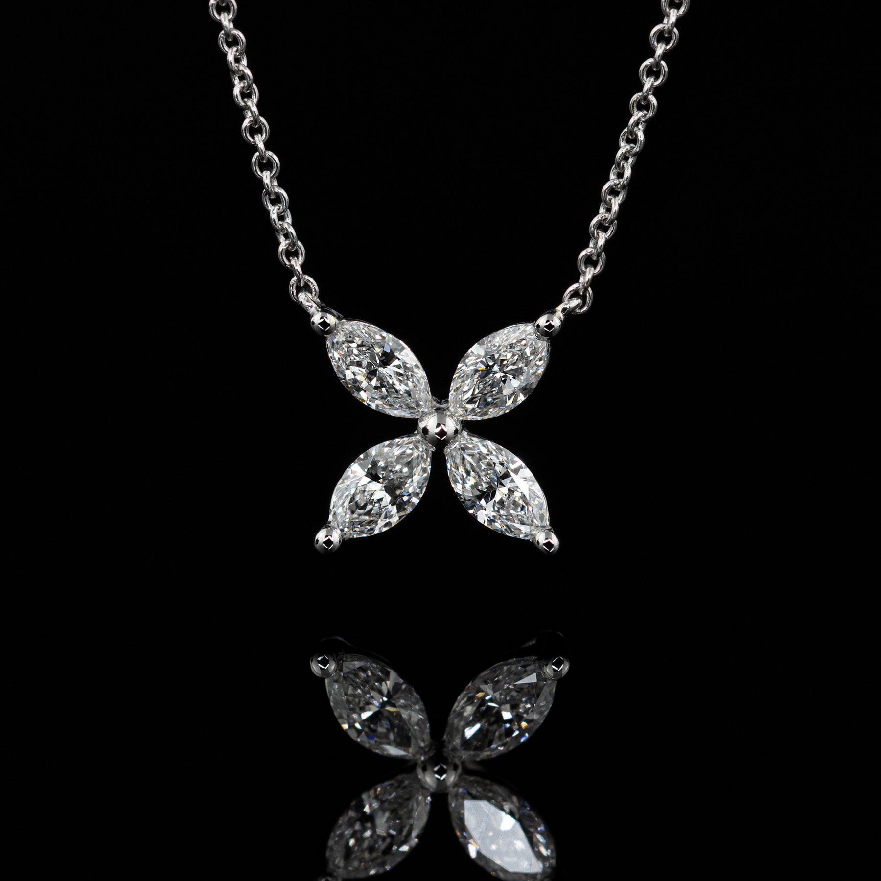 Xenia ist ein Collier mit einem zauberhaften blütenförmigen Anhänger. Vier navette-förmige Diamanten werden von feinen Krappen gehalten und ragen von einem zentralen Mittelpunkt nach außen.