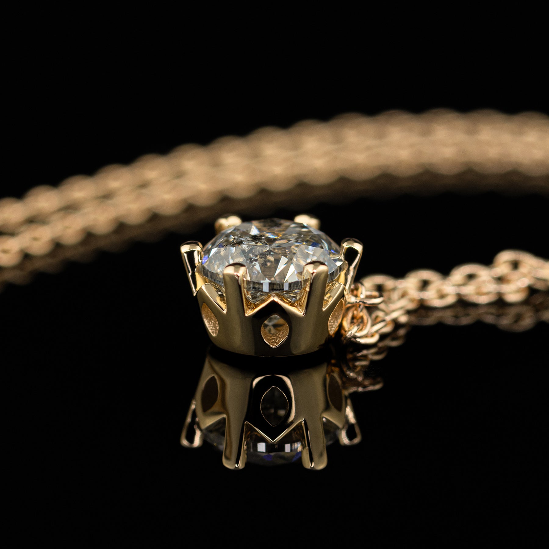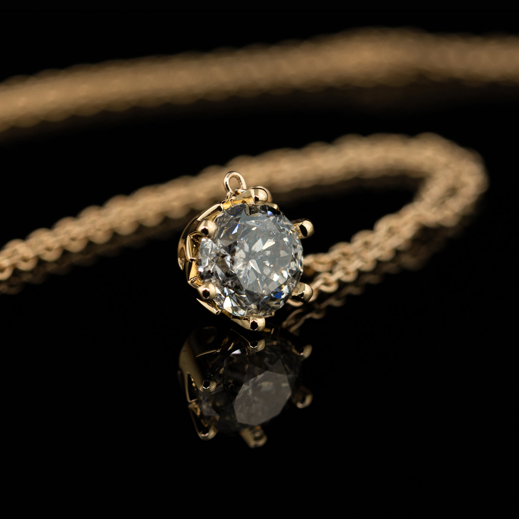 Anstatt eines weißen Brillanten, eignet sich auch ein Salt & Pepper Diamant hervorragend für diesen Kettenanhänger. Schreib uns bei Interesse gerne hier eine Nachricht und wir senden dir eine Steinauswahl per Mail zu.