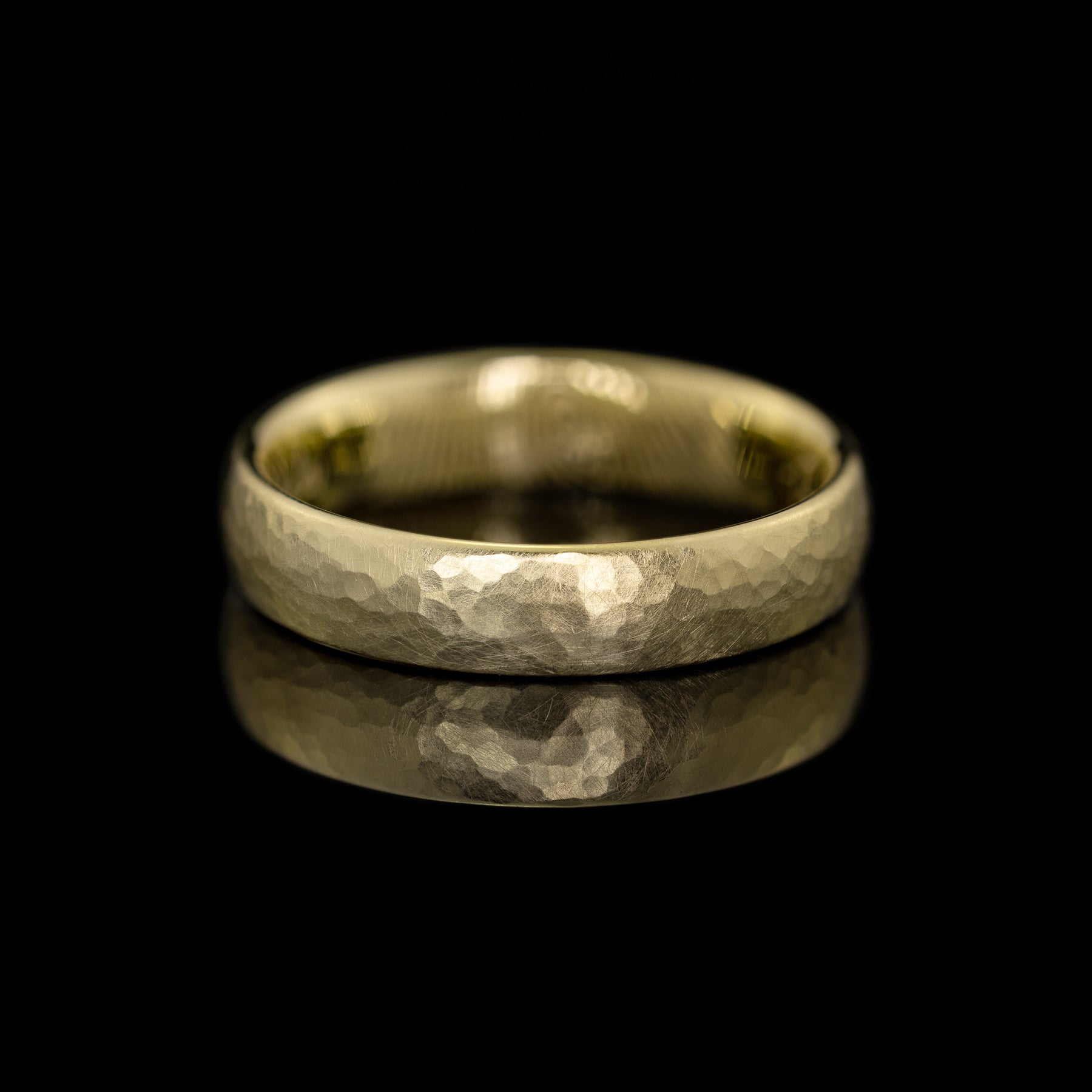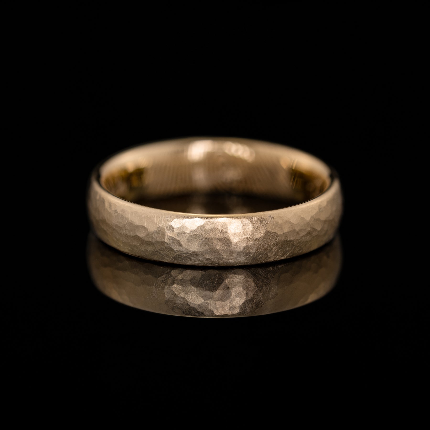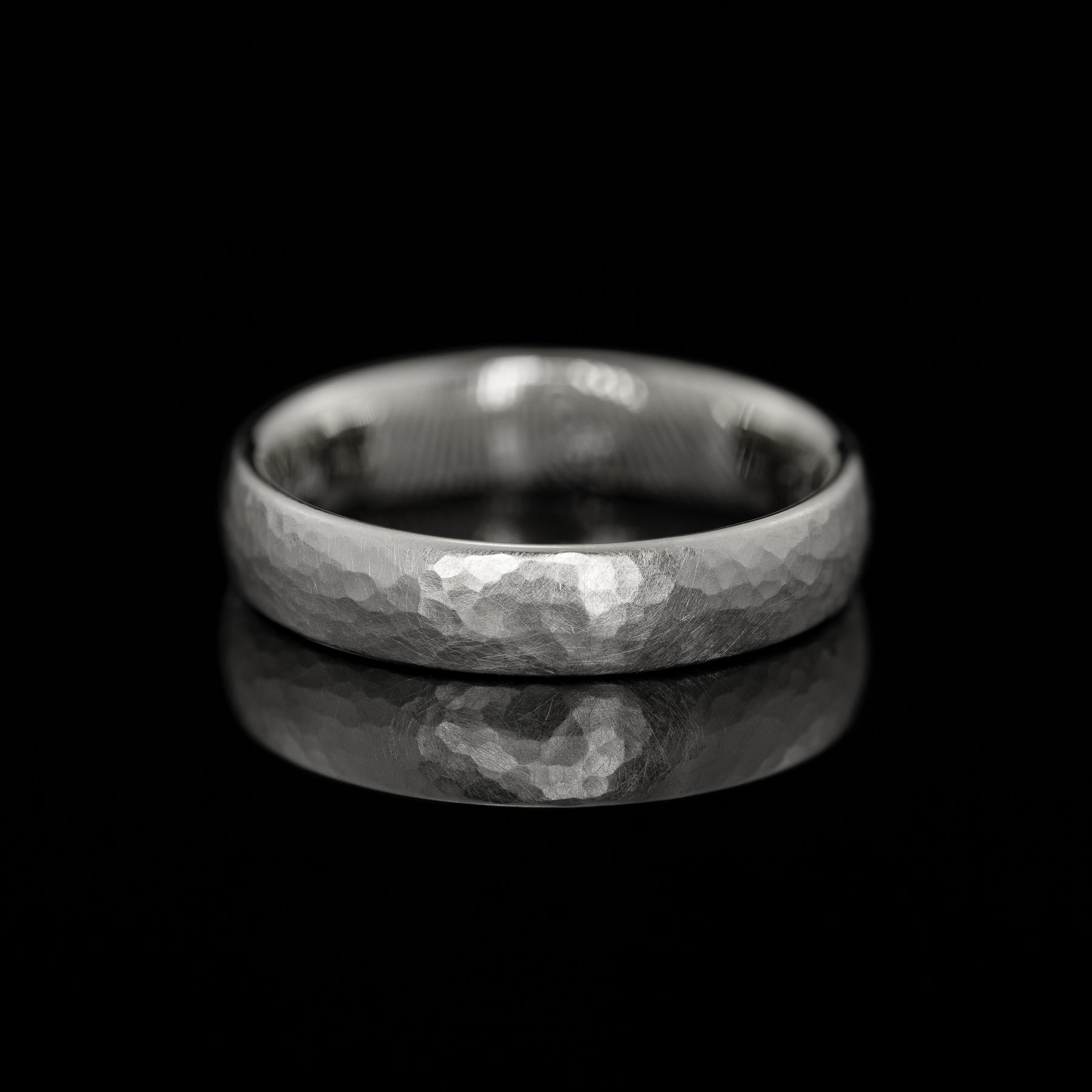 Milan ist ein Ehering mit Tiefe: der kleine, runde Hammerschlag verleiht ihm eine kraftvolle, aber unaufdringliche Präsenz. Durch die unregelmäßige Oberfläche entsteht ein lebendiges Spiel aus Licht und Tiefe, dabei bleibt das Design reduziert und modern. Kein Ring gleicht dem anderen, denn jede Oberfläche entsteht in präziser Handarbeit und macht ihn zu einem ganz persönlichen Schmuckstück.